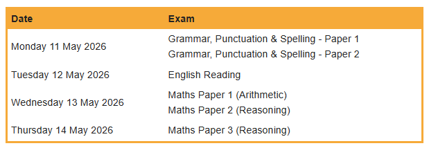 There are three English papers (Spelling, Grammar and Punctuation and Reading), and 3 Maths papers (Arithmetic 1, Reasoning 2 and Reasoning 3). The timetable set by the testing agency for this year is:
